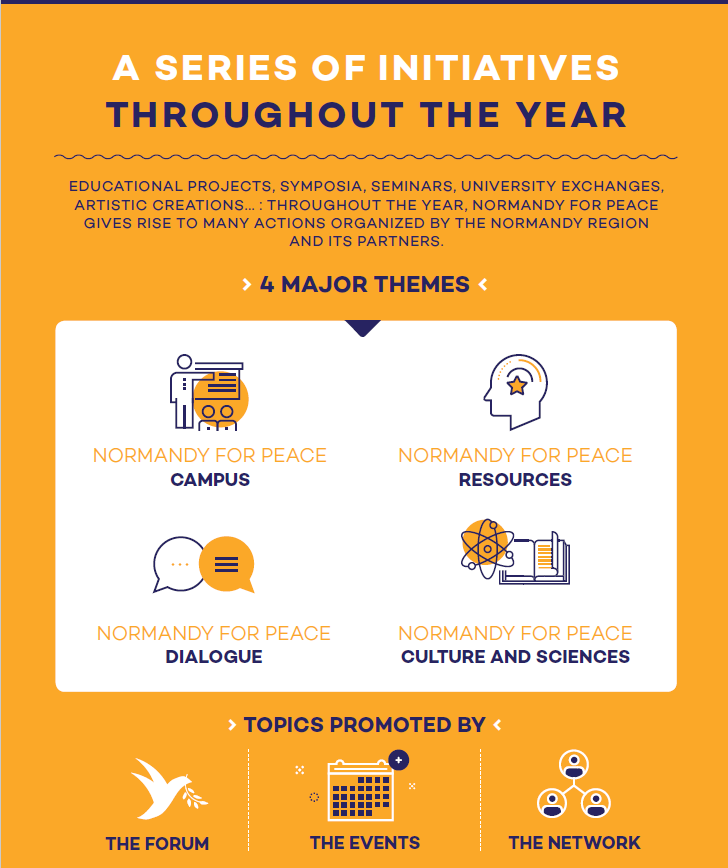 The Normandy for Peace initiative is the result of the Region’s desire to continue the work which began in 1945 to promote remembrance in Normandy and to become a laboratory for lasting peace. During the World Forum and throughout the year, initiatives, certified projects and events promote the values of peace and freedom which are so important to Normandy.