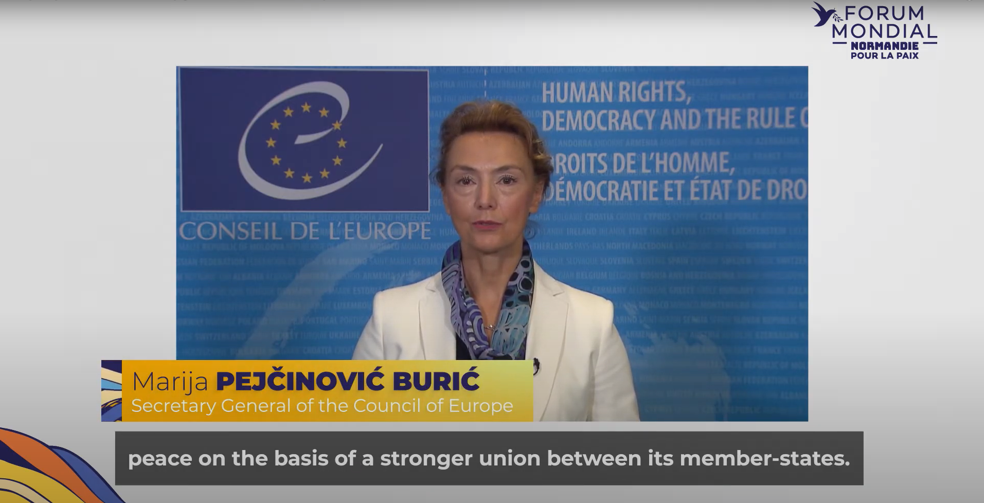 Marija Pejcinovic Buric, Secretary General of the Council Europe, addresses a video message about new technologies for the Normandy World Peace Forum 2020.