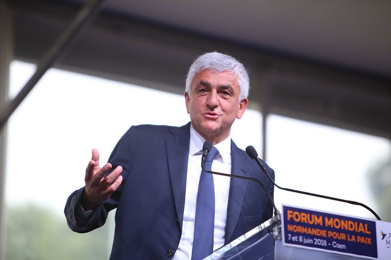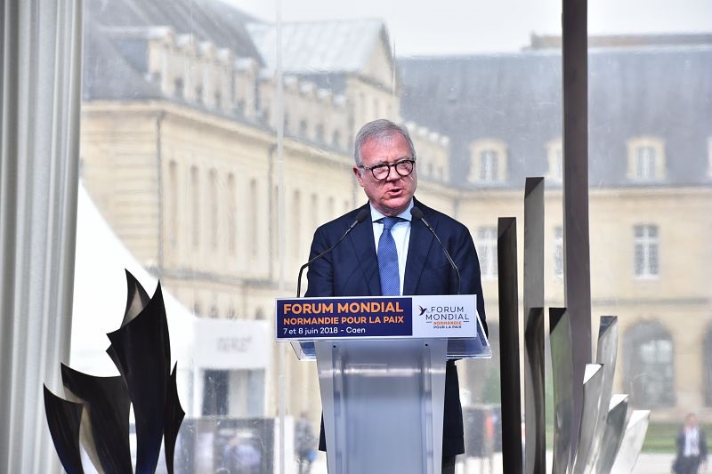 Le Forum mondial Normandie pour la Paix est lancé par un discours d’ouverture d’Hervé Morin, président de la Région Normandie suivi d'une intervention de Ramon Luis Valcarcel Siso, vice-président du Parlement européen.