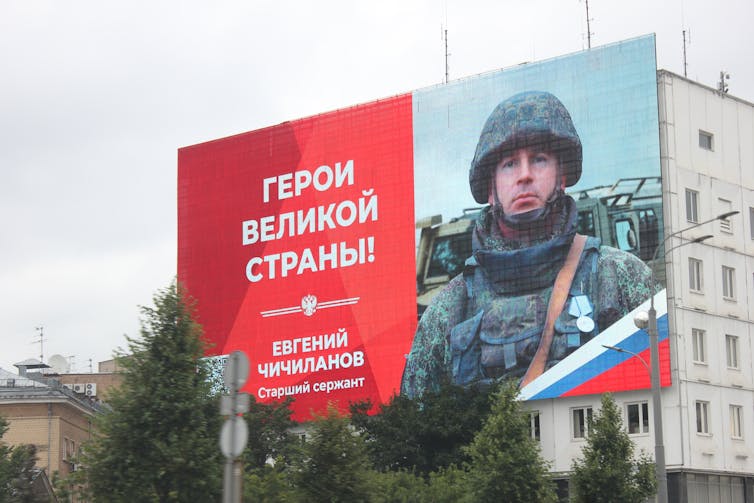 Dans toutes les villes, de grandes affiches, parfois de la taille d’un immeuble entier, célèbrent les militaires participant à la guerre en Ukraine, présentés comme des « héros de la patrie ». Arnold O. A. Pinto/Shutterstock